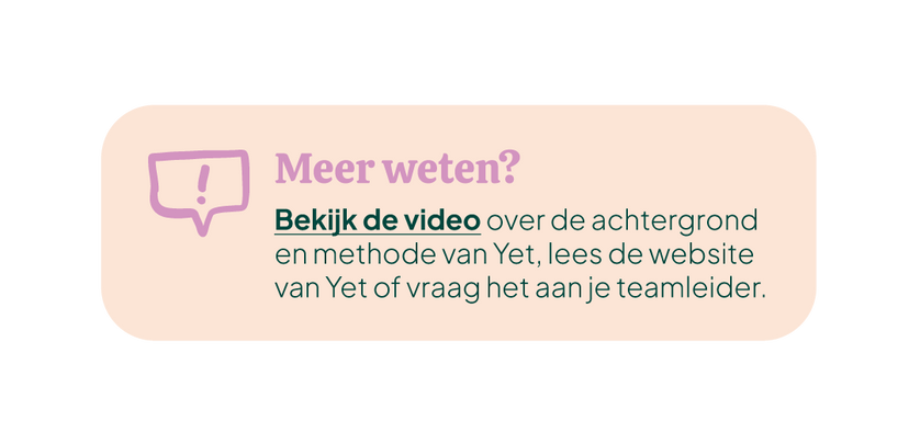 Informatie over Yet: wat is Yet, wat is het effect, hoe werkt het, wat zijn de ervaringen van andere organisaties, welke experts vind je bij Yet, de rol van de leidinggevenden en veelgestelde vragen. Om mee te sturen met de introductiemail.