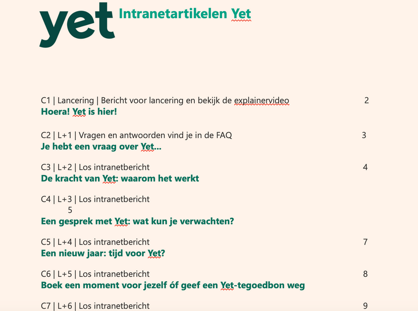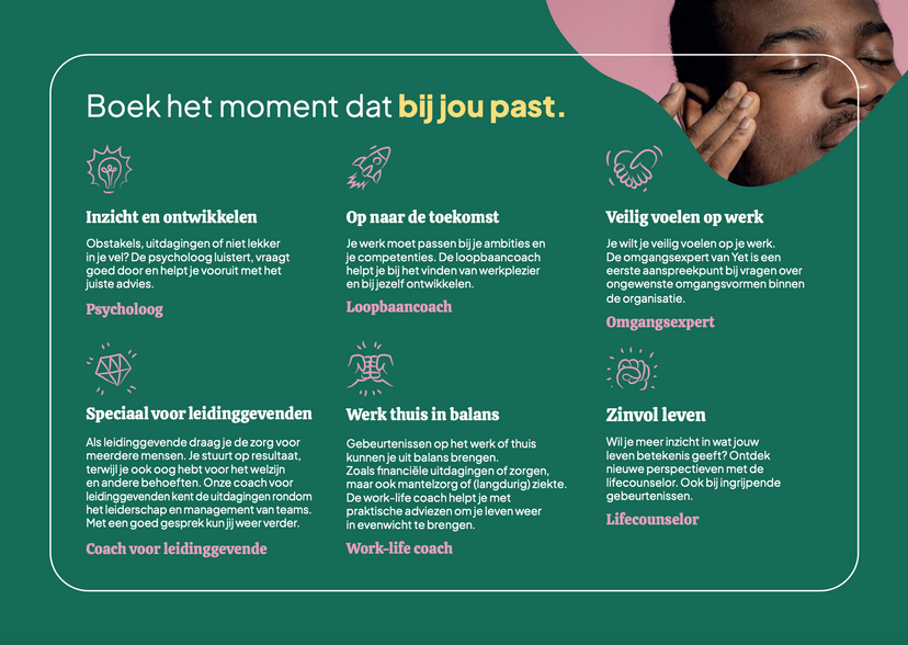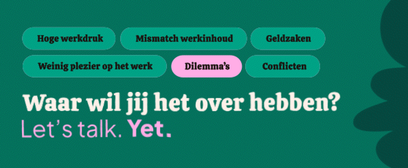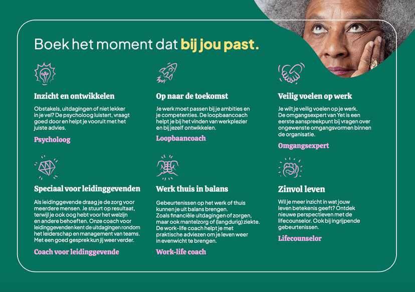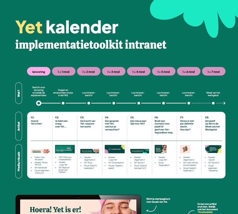 Deze pagina is speciaal voor jou als HR-professional of leidinggevende. Hier vind je handige materialen zoals conceptmails, teksten, gifjes, afbeeldingen, video’s en posters. Hiermee kun je leidinggevenden en medewerkers op de hoogte houden van ons aanbod, zodat Yet het verschil kan maken binnen jouw organisatie.